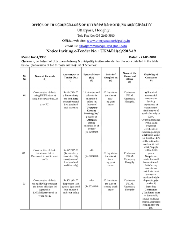 Office of the Councillors of UTTARPARAKOTRUNG MUNICIPALITY Uttarpara, Hooghly. Tele Fax No: 03326633863 Official web site: www.uttarparamunicipality.in email ID: uttarparamunicipality@gmail.comNotice