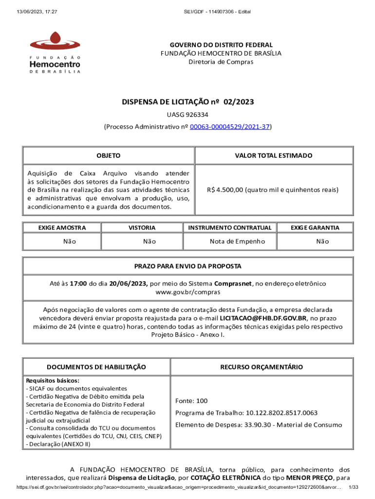 13/06/2023, 17:27SEI/GDF 114907306 EditalGOVERNO DO DISTRITO FEDERAL FUNDAO HEMOCENTRO DE BRASLIA Diretoria de ComprasDISPENSA DE LICITAO n 02/2023 UASG 926334 (Processo Administrativo n0006300004529/202137)