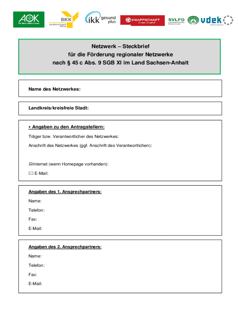 Die Formulare für die regionalen Netzwerke nach § 45c Abs. 1 sind spezifisch und müssen mit den erforderlichen Informationen über die beteiligten Akteure, deren Angebote und die Ziele des Netzwerks ausgefüllt werden.