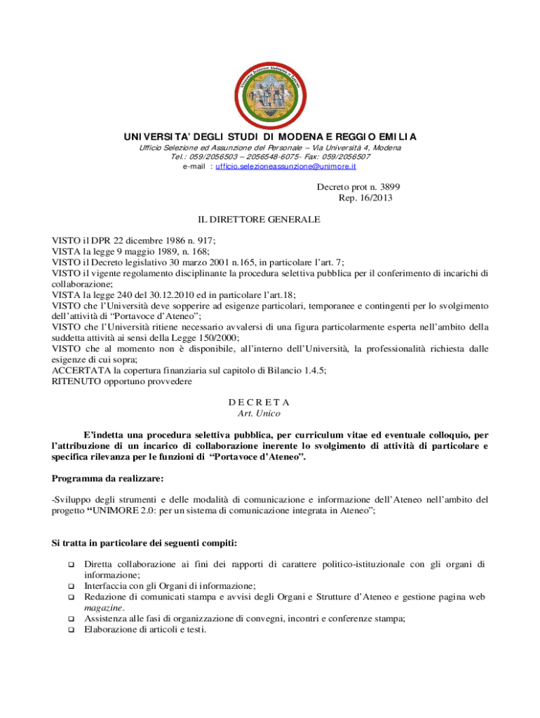 UNIVERSITA DEGLI STUDI DI MODENA E REGGIO EMILIA Ufficio Selezione ed Assunzione del Personale Via Universit 4, Modena Tel.: 059/2056503 20565486075 Fax: 059/2056507 email : ufficio.selezioneassunzione@unimore.itDecreto