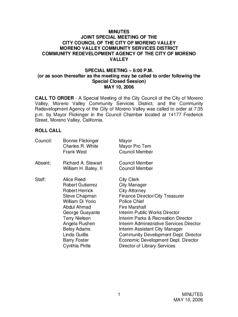 MINUTES JOINT SPECIAL MEETING OF THE CITY COUNCIL OF THE CITY OF MORENO VALLEY COMMUNITY SERVICES DISTRICT COMMUNITY REDEVELOPMENT AGENCY OF THE CITY OF MORENO VALLEY SPECIAL MEETING 6:00 P.M. (or