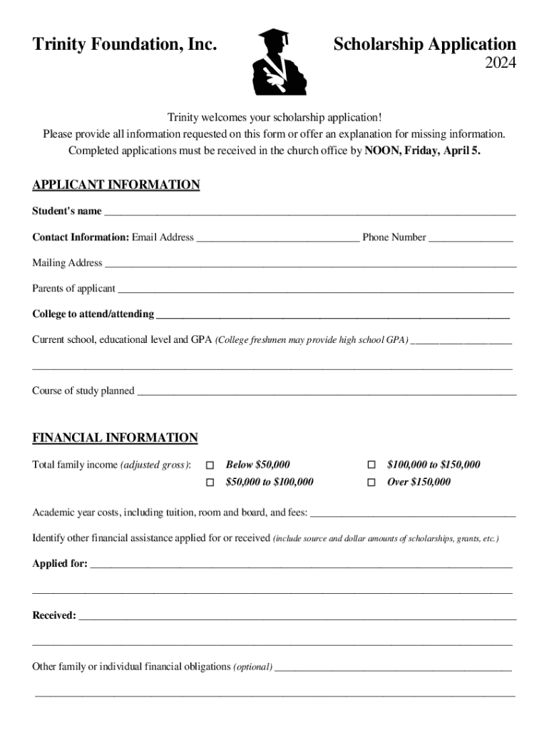 Trinity Foundation, Inc.Scholarship Application 2024Trinity welcomes your scholarship application! Please provide all information requested on this form or offer an explanation for missing information.
