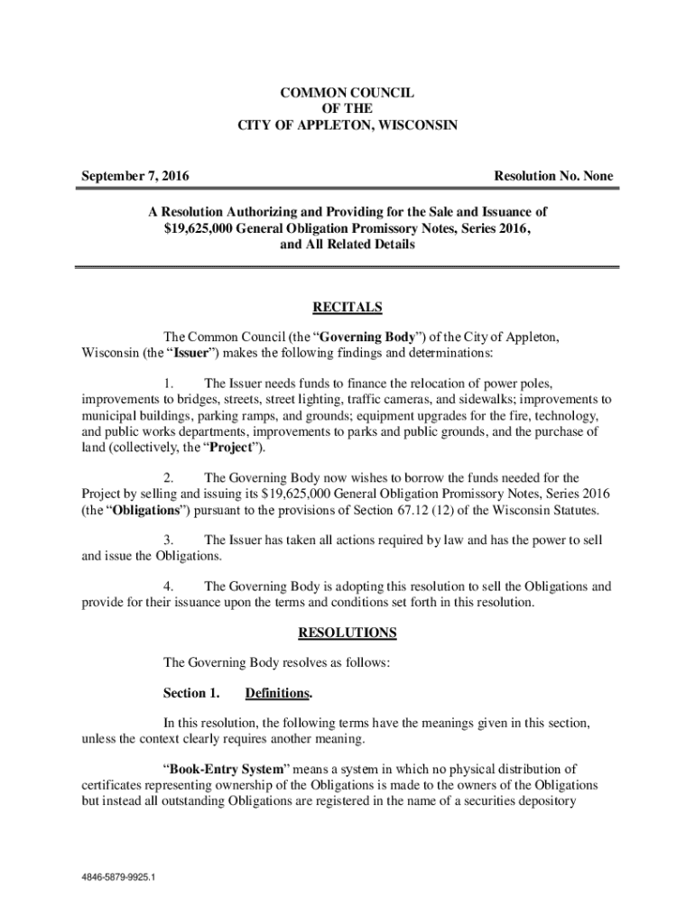 COMMON COUNCIL OF THE CITY OF APPLETON, WISCONSINSeptember 7, 2016Resolution No. NoneA Resolution Authorizing and Providing for the Sale and Issuance of $19,625,000 General Obligation Promissory Notes,