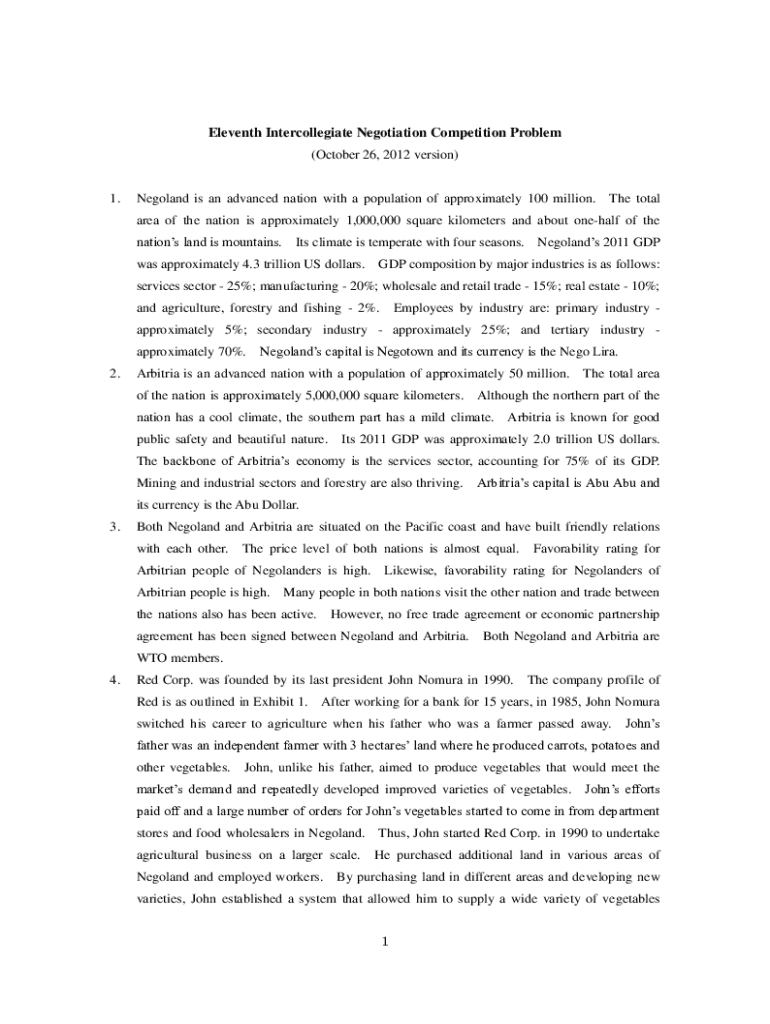 Eleventh Intercollegiate Negotiation Competition Problem (October 26, 2012 version)1.Negoland is an advanced nation with a population of approximately 100 million.The totalarea of the nation is approximately
