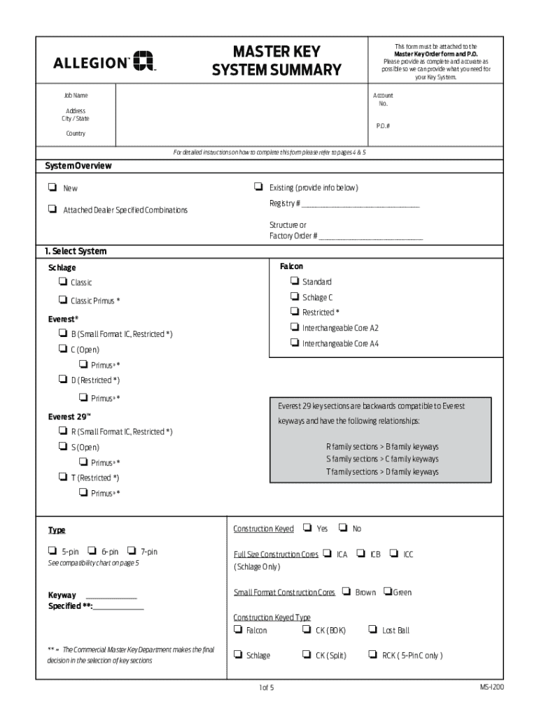 MASTER KEY SYSTEM SUMMARYThis form must be attached to the Master Key Order form and P.O. Please provide as complete and accurate as possible so we can provide what you need for your Key System.Job