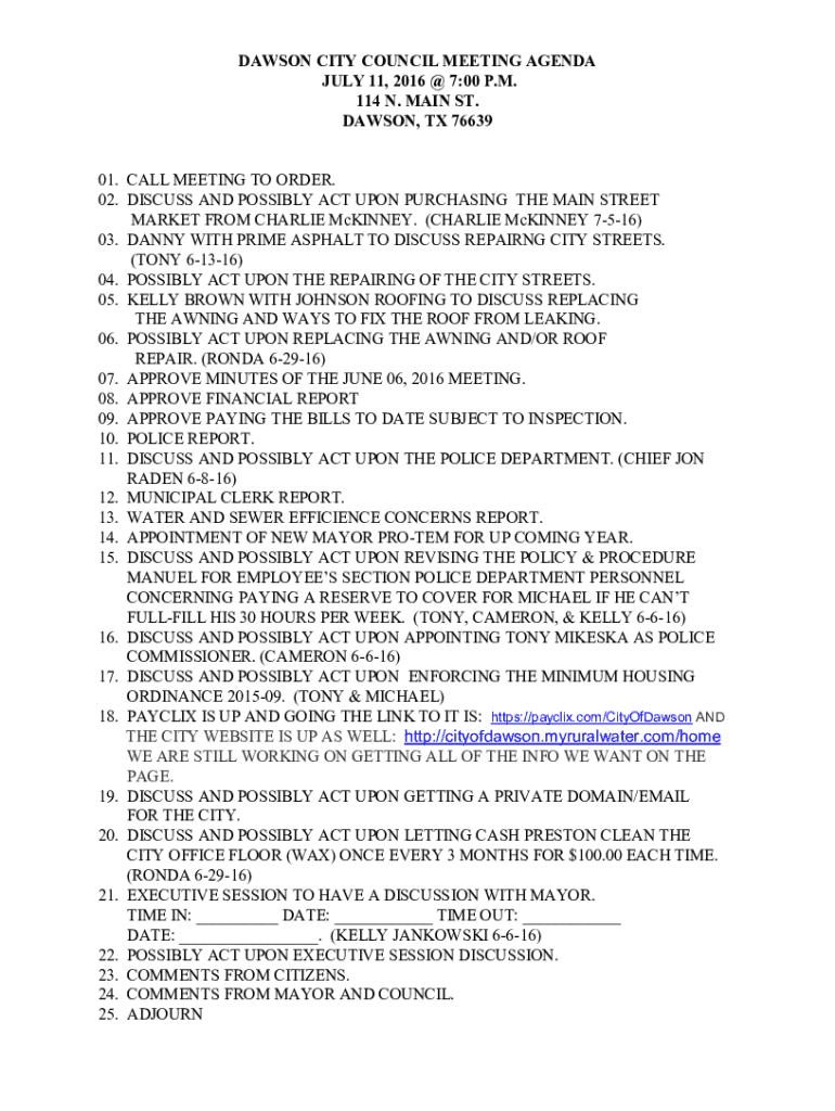 DAWSON CITY COUNCIL MEETING AGENDA JULY 11, 2016 @ 7:00 P.M. 114 N. MAIN ST. DAWSON, TX 7663901. CALL MEETING TO ORDER. 02. DISCUSS AND POSSIBLY ACT UPON PURCHASING THE MAIN STREET MARKET FROM CHARLIE