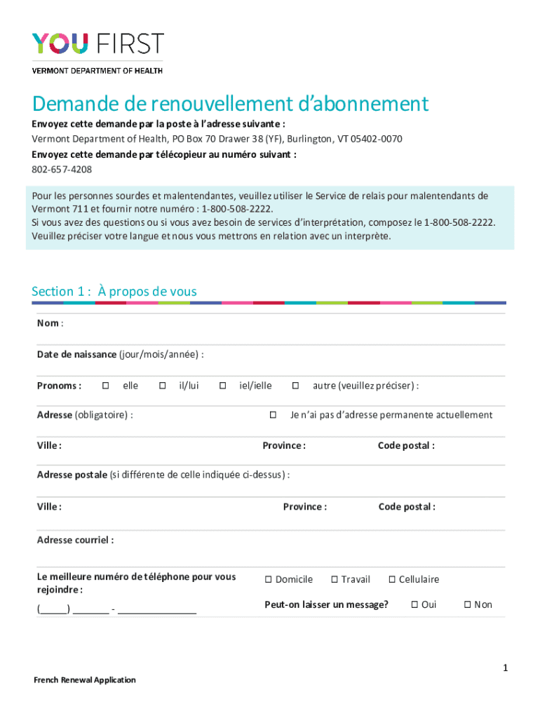 Demande de renouvellement dabonnementEnvoyez cette demande par la poste ladresse suivante : Vermont Department of Health, PO Box 70 Drawer 38 (YF), Burlington, VT 054020070 Envoyez cette demande par