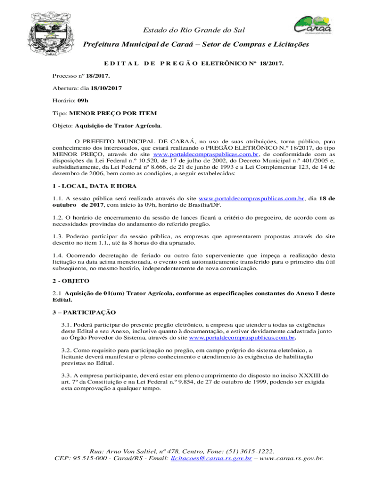 Estado do Rio Grande do Sul Prefeitura Municipal de Cara Setor de Compras e Licitaes E D I T A L D E P R E G O ELETRNICO N 18/2017. Processo n 18/2017. Abertura: dia 18/10/2017 Horrio: 09h Tipo: MENOR