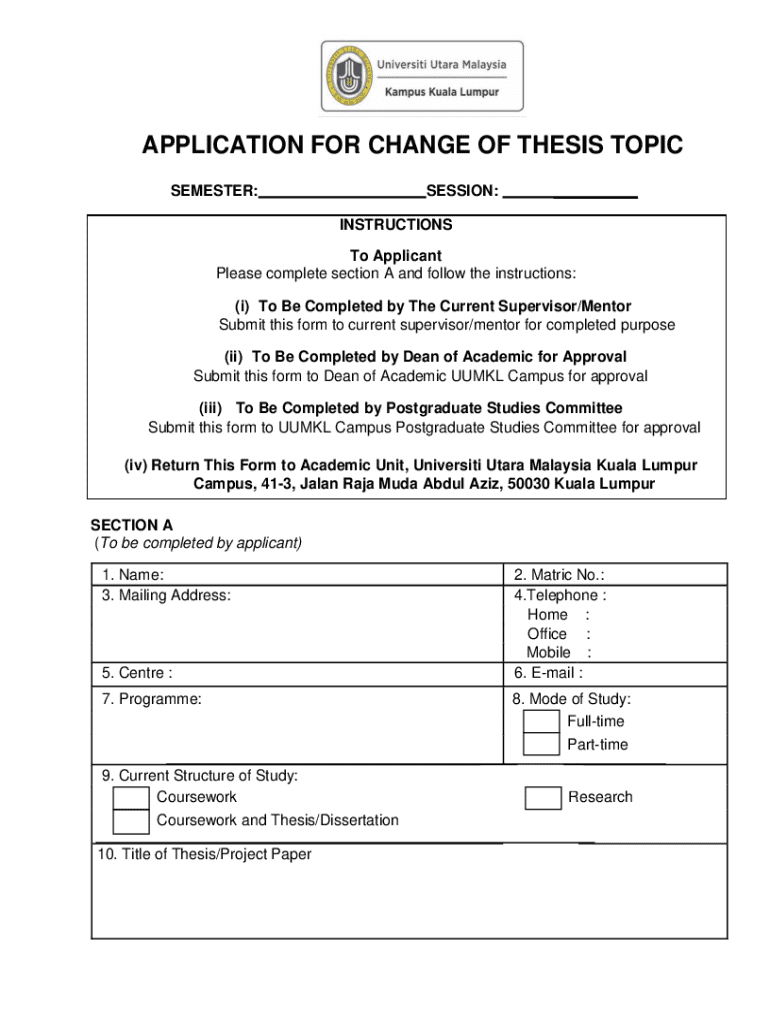APPLICATION FOR CHANGE OF THESIS TOPIC SEMESTER:SESSION:___INSTRUCTIONS To Applicant Please complete section A and follow the instructions: (i) To Be Completed by The Current Supervisor/Mentor Submit
