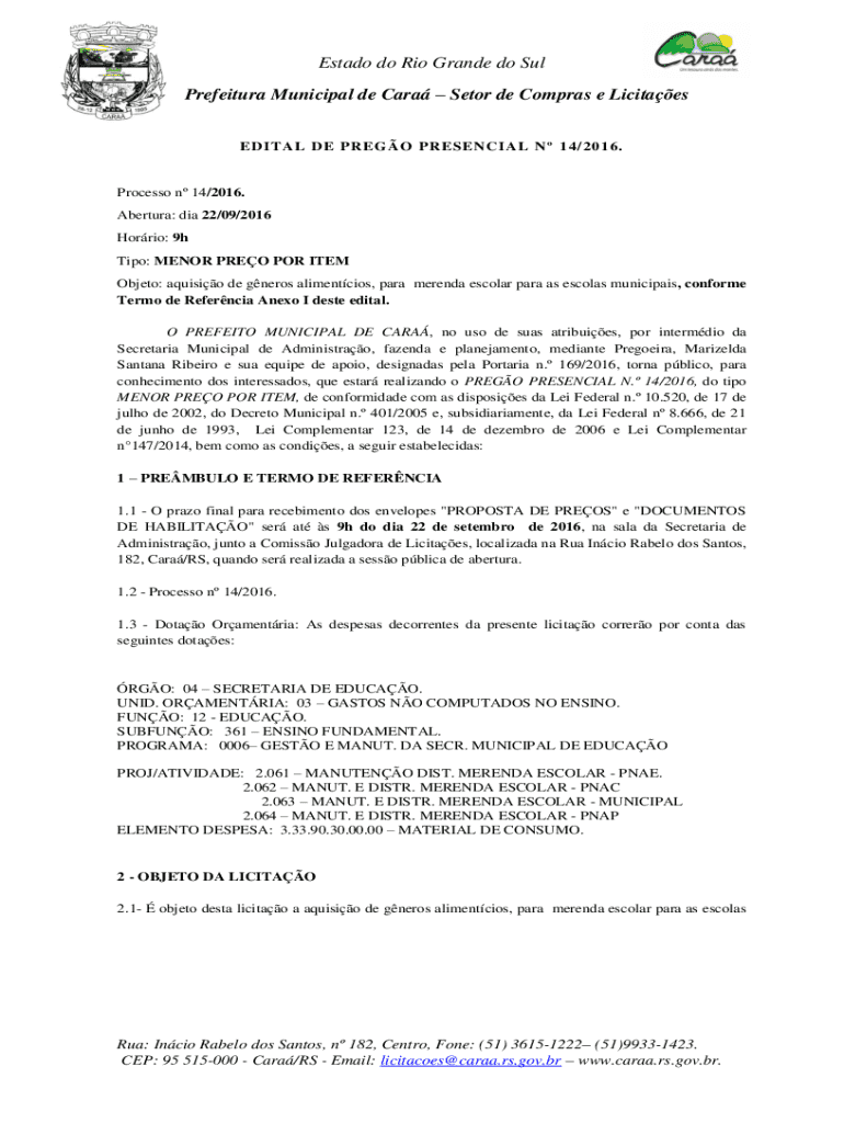Estado do Rio Grande do Sul Prefeitura Municipal de Cara Setor de Compras e LicitaesEDITAL DE PREGO PRESENCIAL N 14/2016.Processo n 14/2016. Abertura: dia 22/09/2016 Horrio: 9h Tipo: MENOR PREO POR