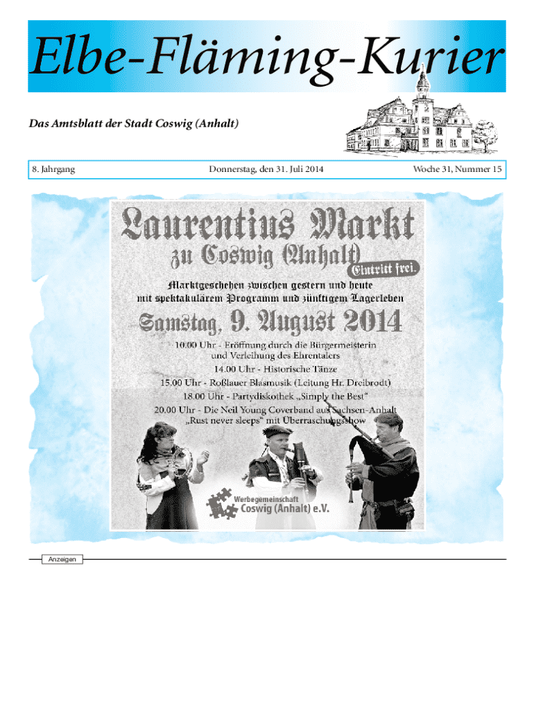 Was Amtsblatt her Start Cos wig (An halt)8. JahrgangAnzeigenDonnerstag, den 31. July 2014Woche 31, Number 15231.07.2014Nr. 15/2014ElbeFlmingKurierBereitschaftsdienste ElbeFlmingKurier