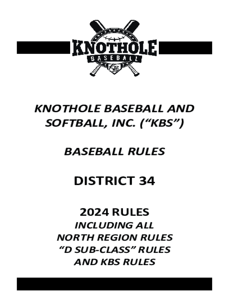 KNOTHOLE BASEBALL KNOTHOLE BASEBALL LLCAND (KB) SOFTBALL, INC. (KBS) BASEBALL RULESDISTRICT 34 DISTRICT 342018 RULES INCLUDING ALL 2024 RULESNORTH REGIONALL RULES INCLUDING DNORTH SUBCLASS RULES REGION