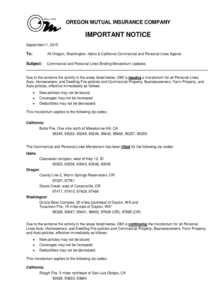 September11, 2015To:All Oregon, Washington, Idaho & California Commercial and Personal Lines AgentsSubject:Commercial and Personal Lines Binding Moratorium