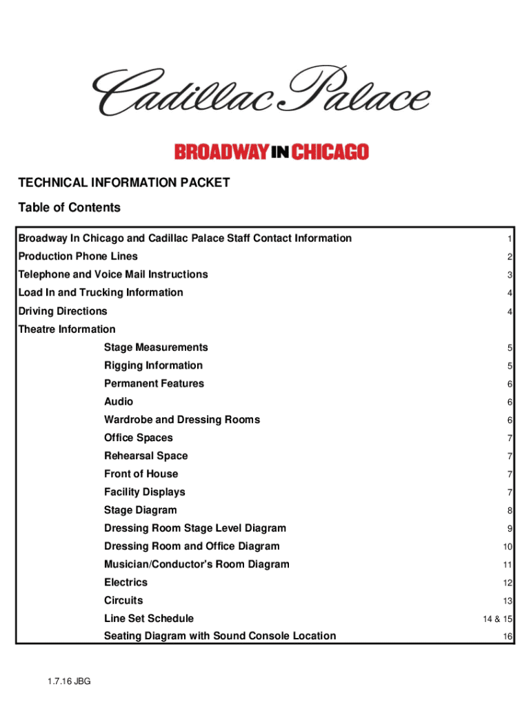 TECHNICAL INFORMATION PACKET Table of Contents Broadway In Chicago and Cadillac Palace Staff Contact Information1Production Phone Lines2Telephone and Voice Mail Instructions3Load In and Trucking Information4Driving
