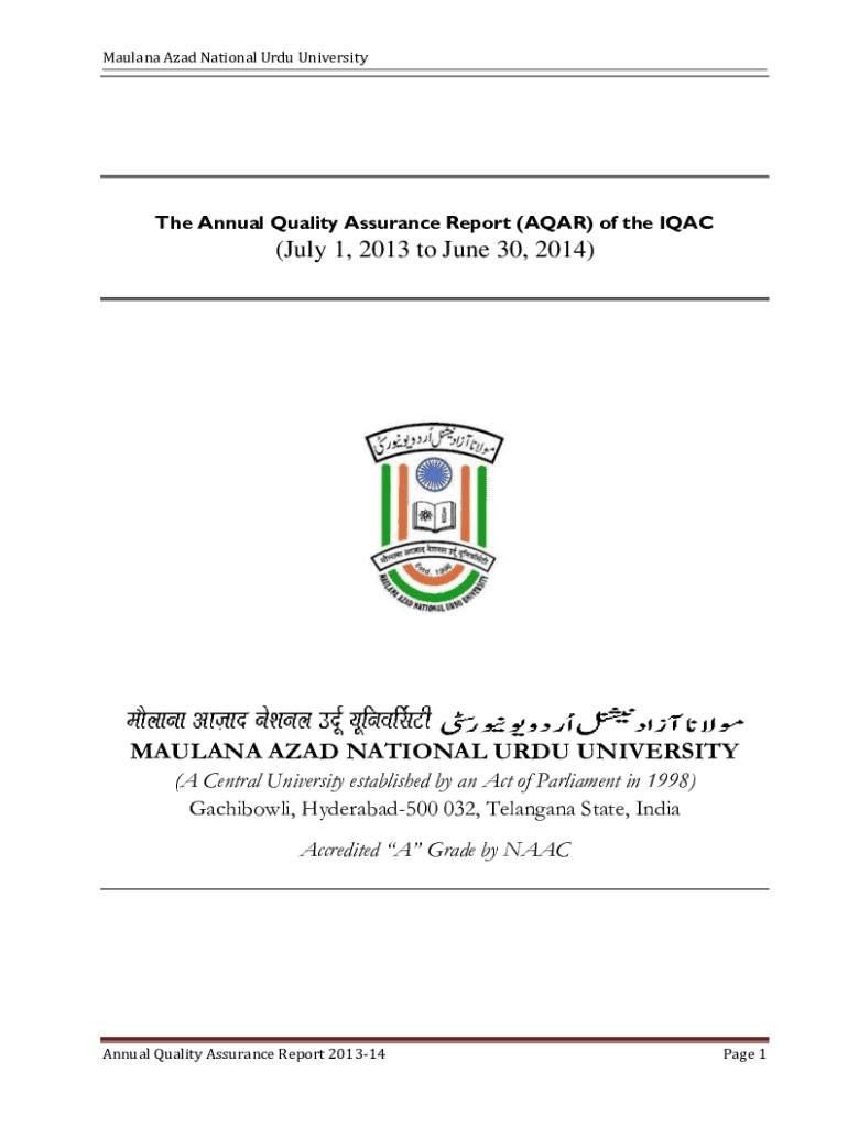 Maulana Azad National Urdu University Annual Quality Assurance Report (AGAR) of the IAC(July 1, 2013, to June 30, 2014)MAULANA AZAD NATIONAL URDU UNIVERSITY