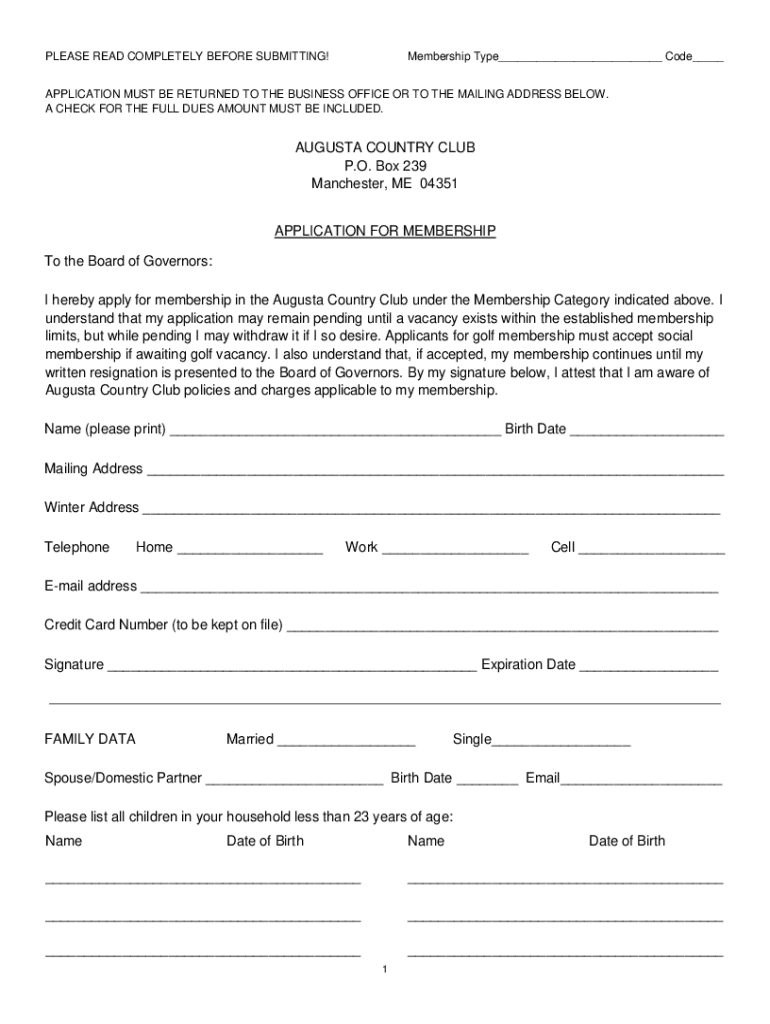 PLEASE READ COMPLETELY BEFORE SUBMITTING! Membership Type___ Code___APPLICATION MUST BE RETURNED TO THE BUSINESS OFFICE OR TO THE MAILING ADDRESS BELOW. A CHECK FOR THE FULL DUES AMOUNT MUST BE INCLUDED.AUGUSTA