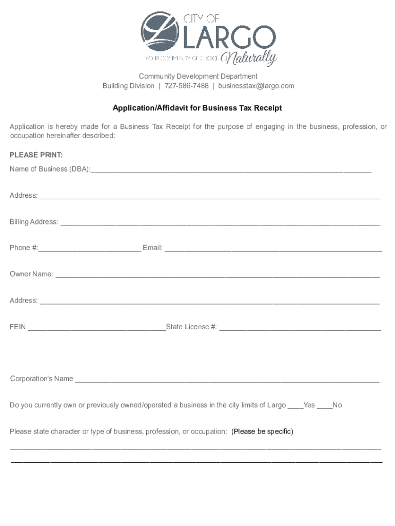 Community Development Department Building Division | 7275867488 | businesstax@largo.comApplication/Affidavit for Business Tax Receipt Application is hereby made for a Business Tax Receipt for the