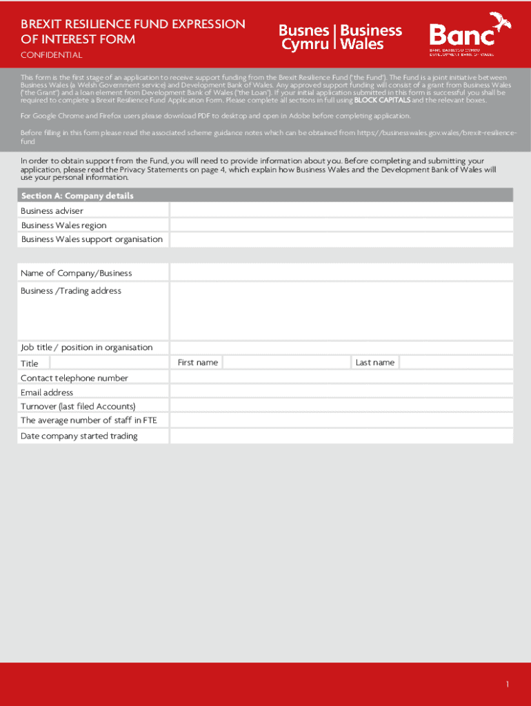 This form is the first stage of an application to receive support funding from the Brexit Resilience Fund (\”the Fund\”). The Fund