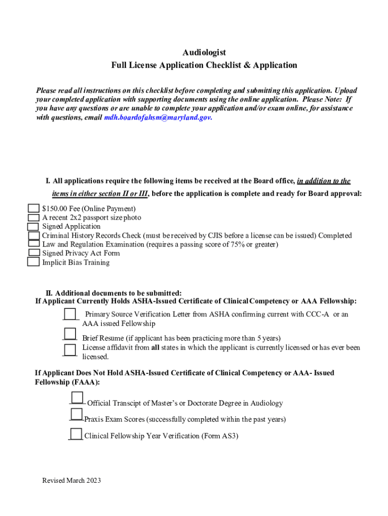 Audiologist Full License Application Checklist & Application Please read all instructions on this checklist before completing and submitting this application. Upload your completed application with