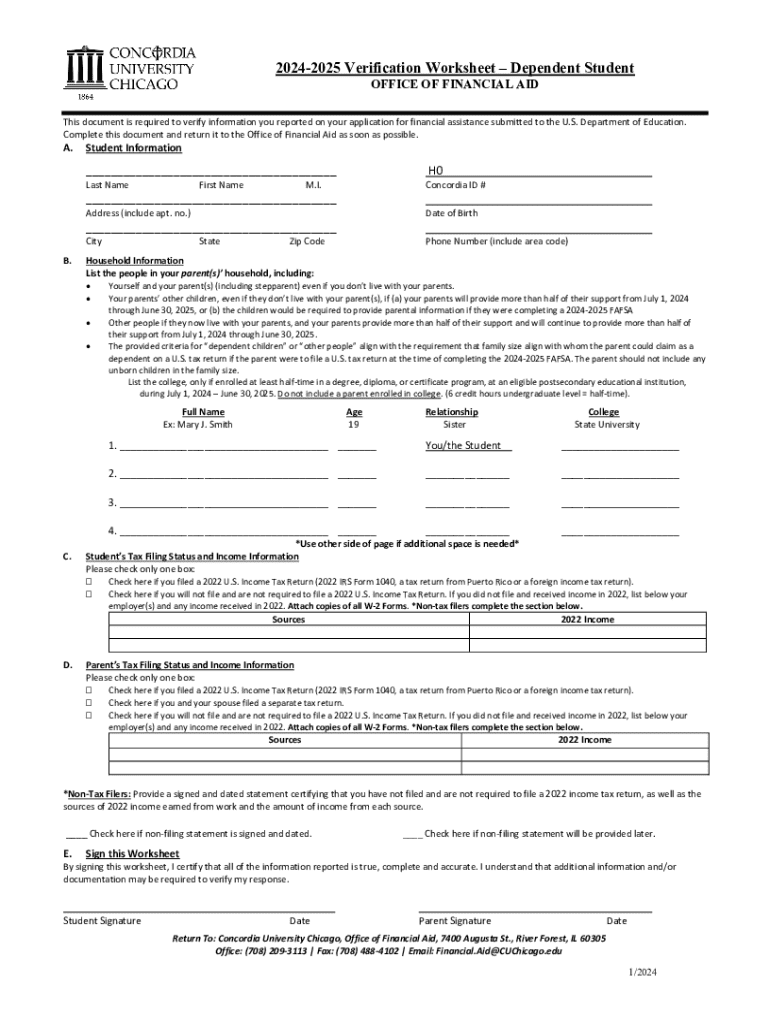 Edit 2024-2025 verification worksheet dependent. Rearrange and rotate pages, insert new and alter existing texts, add new objects, and take advantage of other helpful tools. Click Done to apply changes and return to your Dashboard. Go to the Documents tab to access merging, splitting, locking, or unlocking functions.