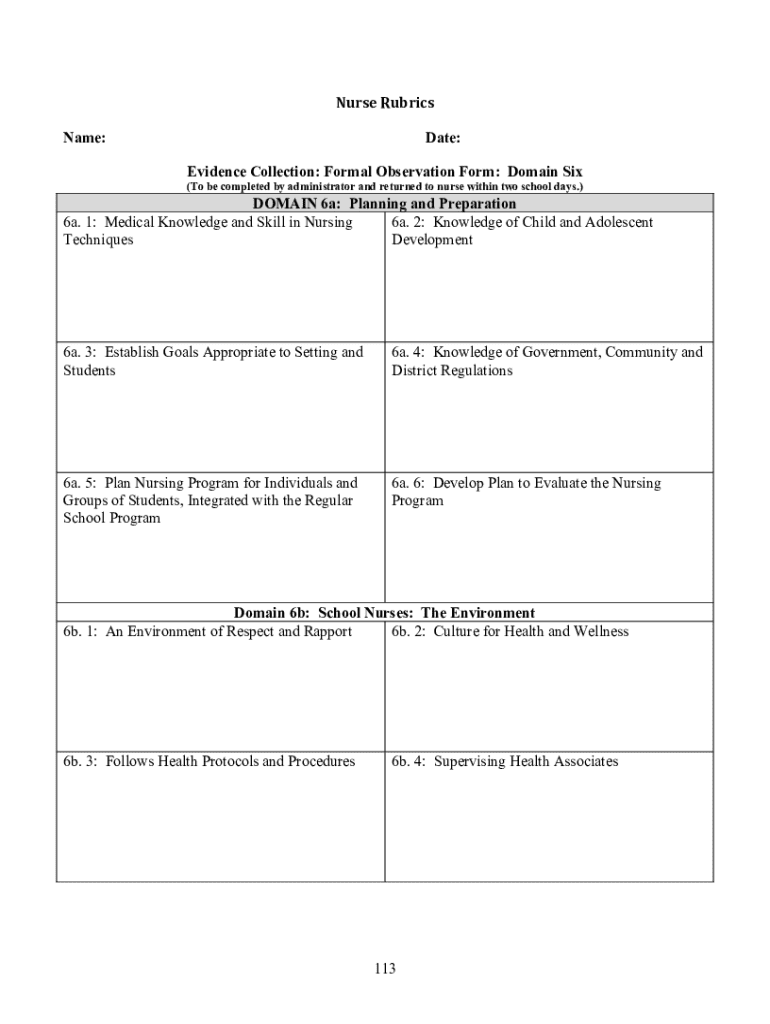 Nurse Rubrics Name:Date: Evidence Collection: Formal Observation Form: Domain Six(To be completed by administrator and returned to nurse within two school days.)DOMAIN 6a: Planning and Preparation