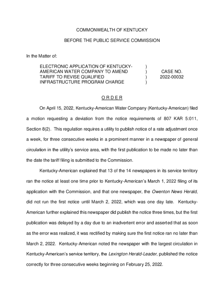 ELECTRONIC APPLICATION OF KENTUCKYAMERICAN WATER COMPANY TO AMEND