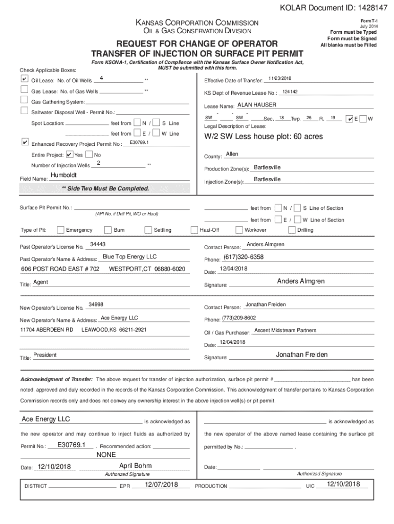 All blanks must be FilledREQUEST FOR CHANGE OF OPERATOR