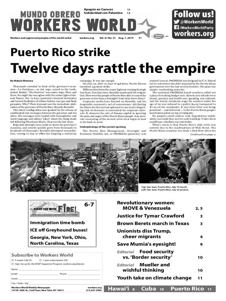 Apagn en Caracas Solidaridad con Palestina1212Workers and oppressed peoples of the world unite! workers.org Vol. 61 No. 31 Aug. 1, 2019 $1Puerto Rico strikeTwelve days rattle the empireBy Makasi Motema