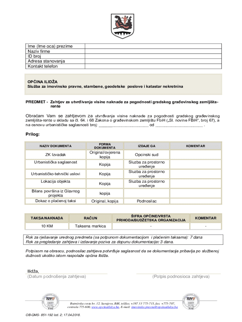 Get the free Sluba za imovinsko pravne, stambene, geodetske poslove i katastar nekretnina