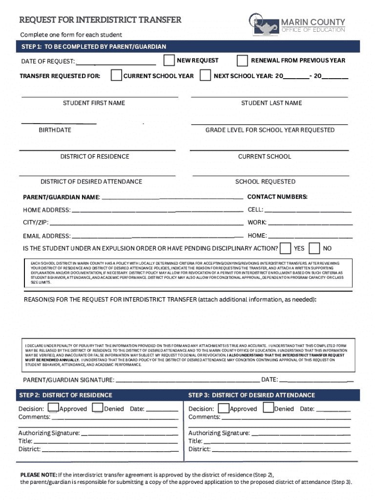 To fill out marin interdistrict transfers, parents must obtain the appropriate form from their current school district, provide necessary information about the student, and submit it to both the current and receiving districts.