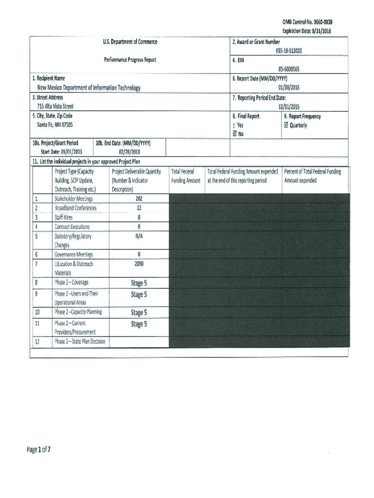 OMB Control No. 06600038 Expiration Date: 8/31/2016 U.S. Department of Commerce2. Award or Grant Number #3510S13035 4. EIN 856000565 6. Report Date (MM/DD/YYY 01/30/2016Performance Progress Report