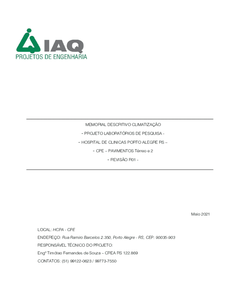 MEMORIAL DESCRIPTIVE CLIMATIC PROJECT LABORATORIES DE MESQUITA HOSPITAL DE CLINICAL PORTO ALEGRE RS
