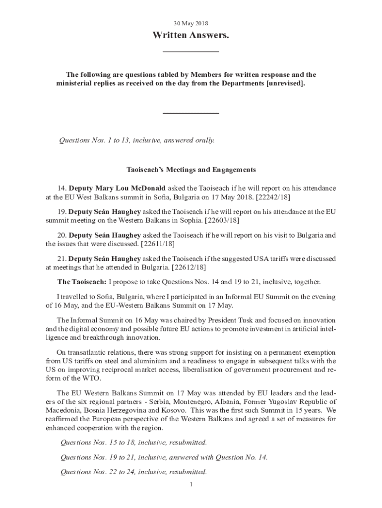 30 May 2018Written Answers. The following are questions tabled by Members for written response and the