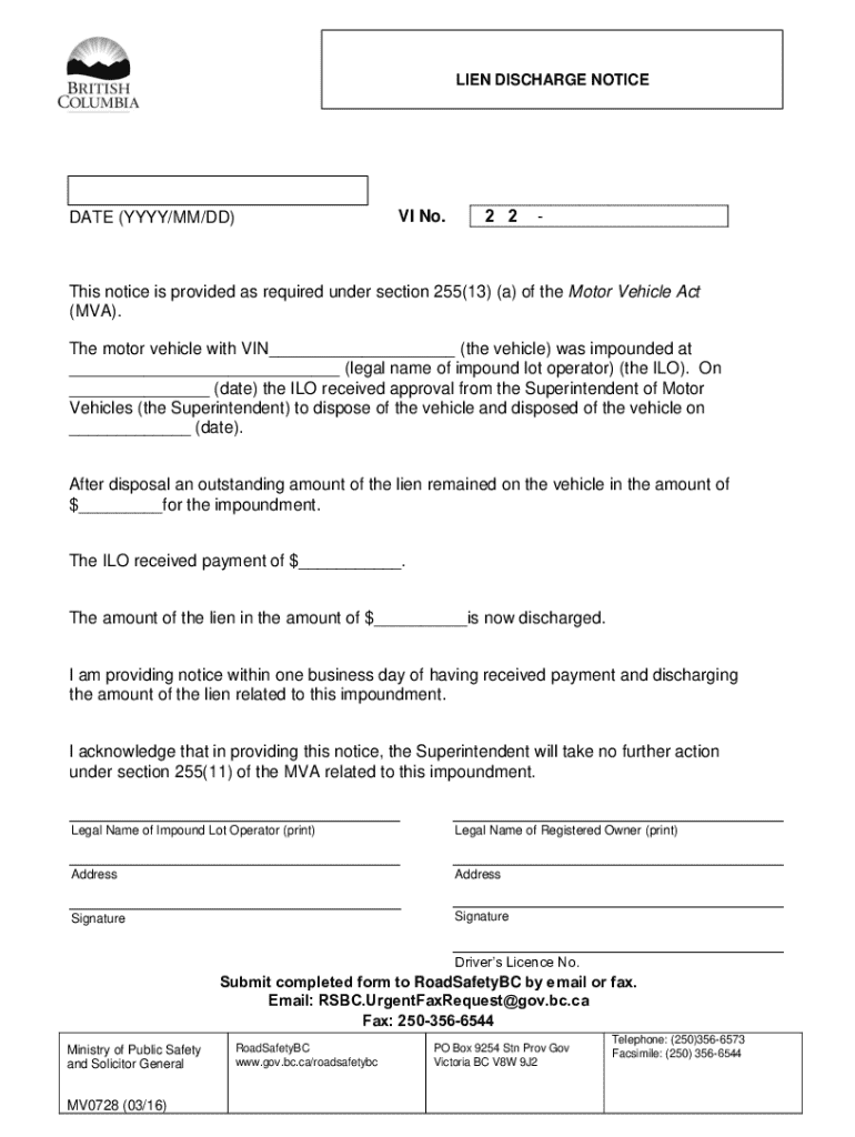 LIEN DISCHARGE NOTICEVI No.DATE (YYYY/MM/DD)2 2This notice is provided as required under section 255(13) (a) of the Motor Vehicle Act (MVA). The motor vehicle with VIN___ (the vehicle) was impounded