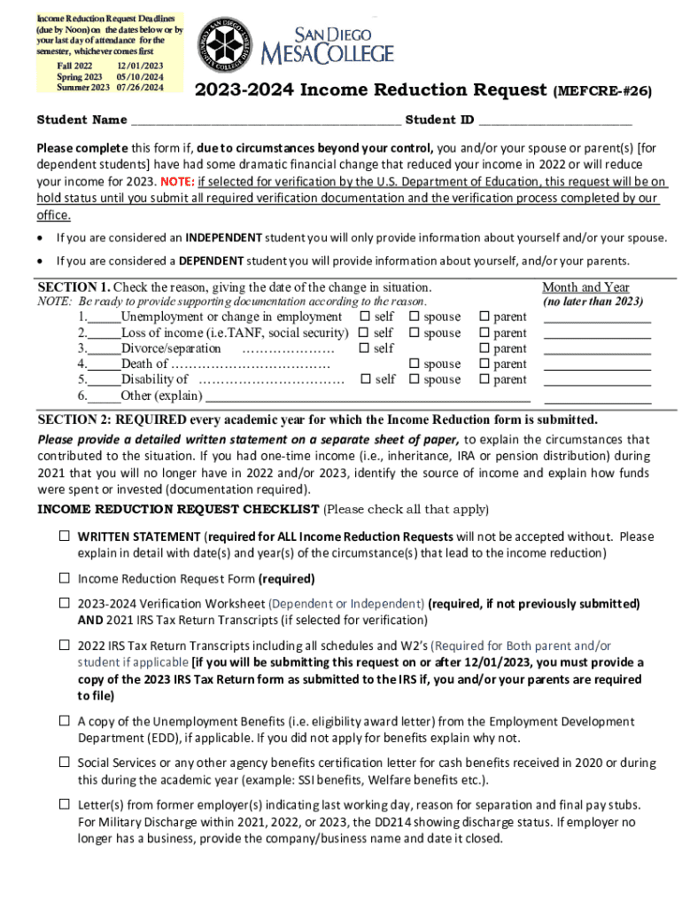 Income Reduction Request Deadlines (due by Noon) on the dates below or by your last day of attendance for the semester, whichever comes first Fall 2022 12/01/2023 Spring 2023 05/10/2024 Summer 2023