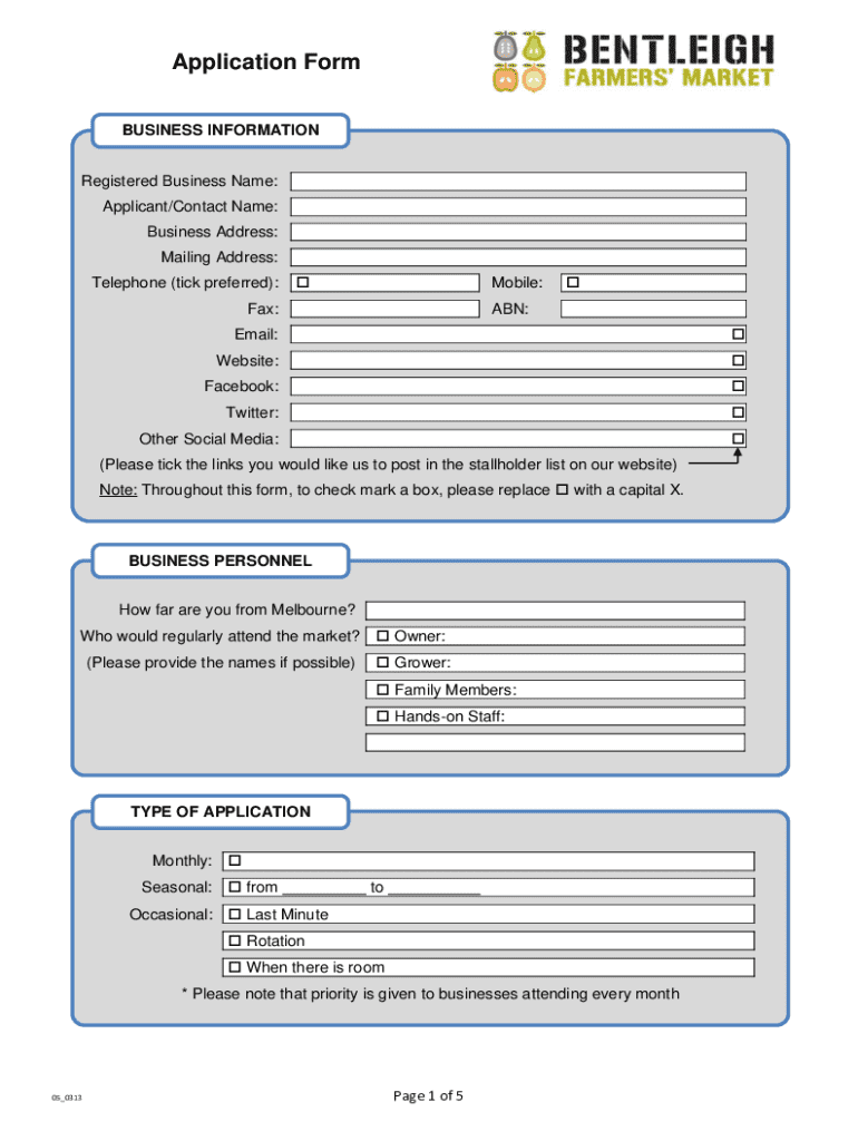 Application Form BUSINESS INFORMATION Registered Business Name: Applicant/Contact Name: Business Address: Mailing Address: Telephone (tick preferred):Mobile:Fax:ABN:Email:Website:Facebook:Twitter:Other