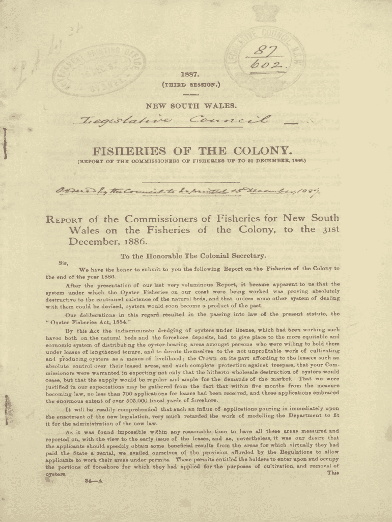 9 %_/ VV/ i y /\' (1:\"1887. , 21I f 7J(third session.)INEW SOUTH WALES. .xFISHERIES OF THE COLONY. (REPORT OP THE COMMISSIONERS OP FISHERIES UP TO 81 DECEMBER, 1886.)y\'sg7Report of the Commissioners