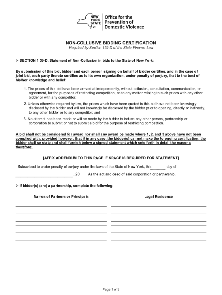NONCOLLUSIVE BIDDING CERTIFICATION Required by Section 139D of the State Finance Law SECTION 1 39D. Statement of NonCollusion in bids to the State of New York: By submission of this bid, bidder and