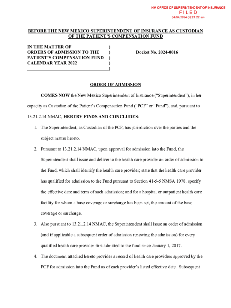 NM OFFICE OF SUPERINTENDENT OF INSURANCEFILED 04/04/2024 08:21:22 amBEFORE THE NEW MEXICO SUPERINTENDENT OF INSURANCE AS CUSTODIAN OF THE PATIENTS COMPENSATION FUND IN THE MATTER OF ) ORDERS OF ADMISSION