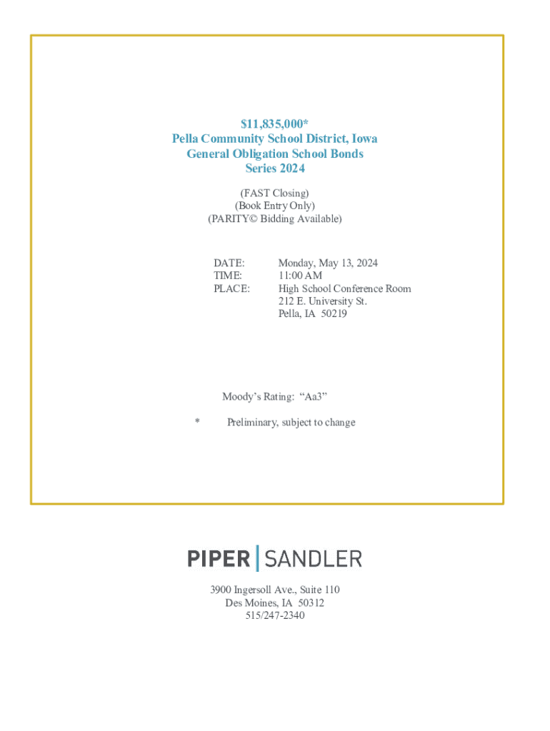 $11,835,000* Pella Community School District, Iowa General Obligation School Bonds Series 2024 (FAST Closing) (Book Entry Only) (PARITY Bidding Available)DATE: TIME: PLACE:Monday, May 13, 2024 11:00