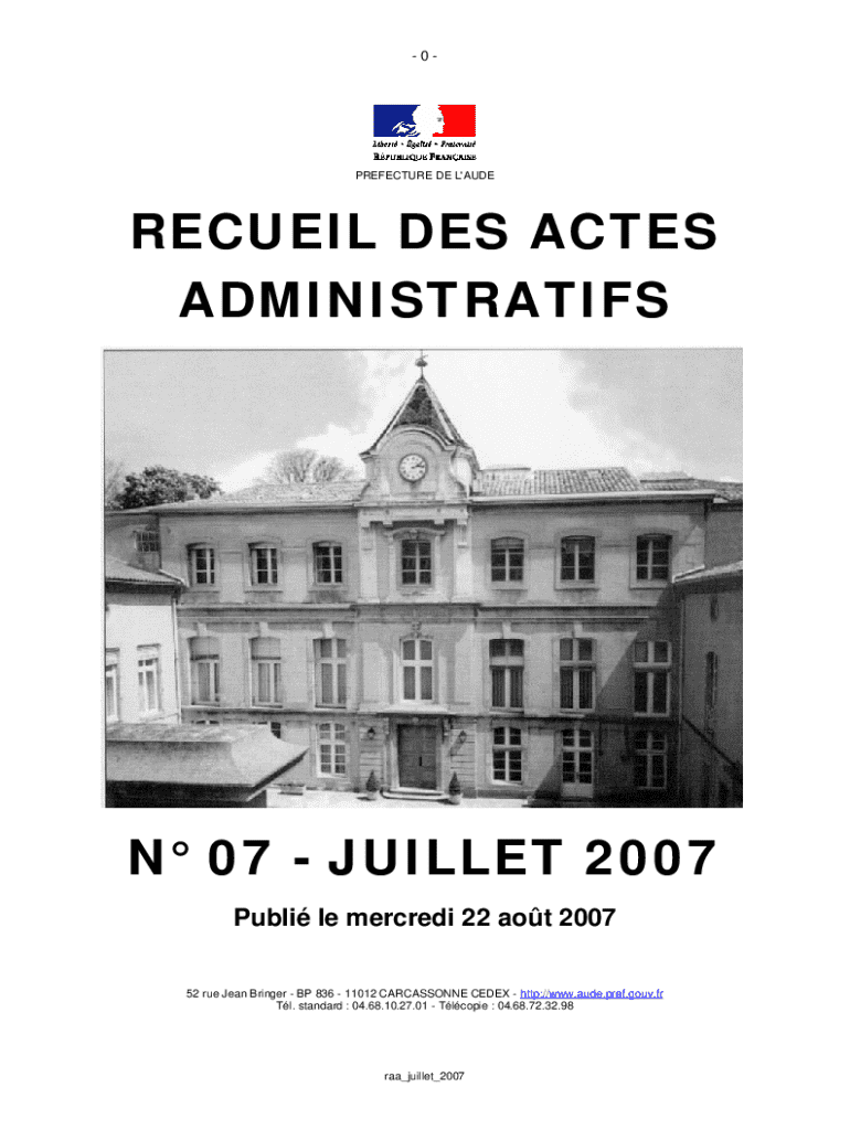 0PREFECTURE DE L\'AUDERECUEIL DES ACTES ADMINISTRATIFSN 07 JUILLET 2007 Publi le mercredi 22 aot 2007 52 rue Jean Bringer BP 836 11012 CARCASSONNE CEDEX http://www.aude.pref.gouv.fr Tl. standard :