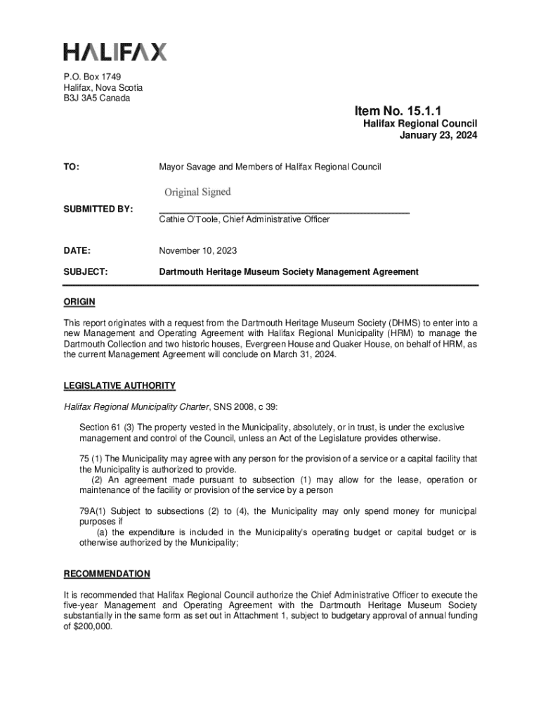 Get the free Dartmouth Heritage Museum Society Management Agreement - Jan 23/24 Regional CouncilH...