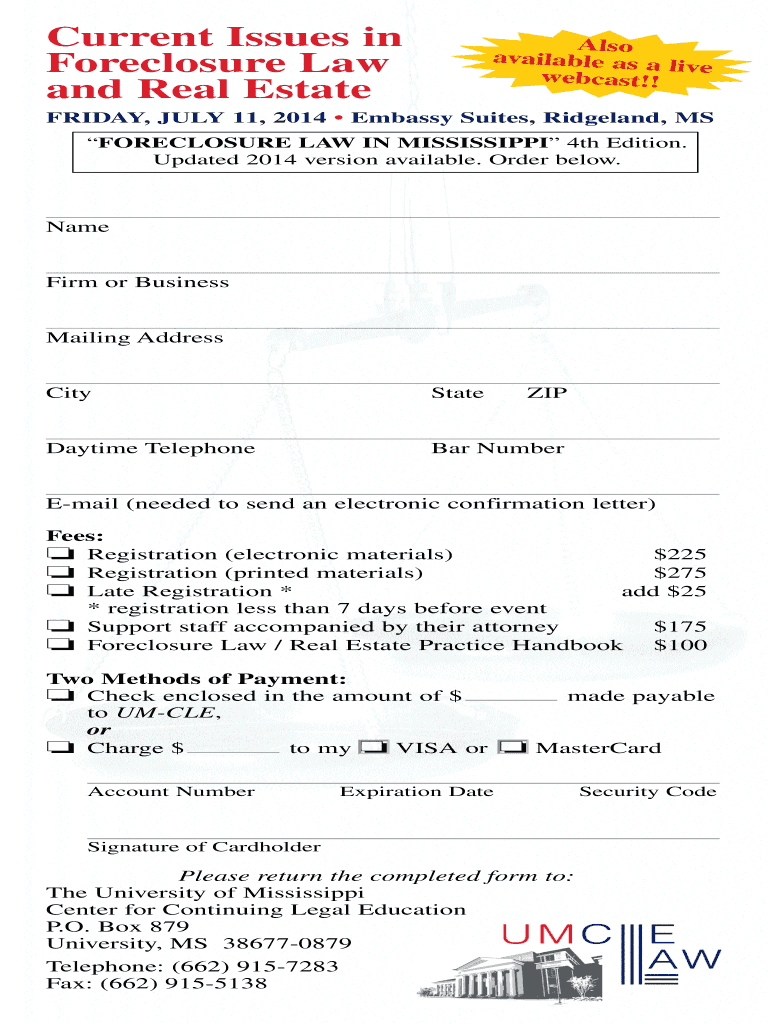 Current Issues in Foreclosure Law and Real Estate FRIDAY, JULY 11, 2014, Embassy Suites, Ridgeland, MS FORECLOSURE LAW IN MISSISSIPPI 4th Edition. Updated 2014 version available. Order below. Name