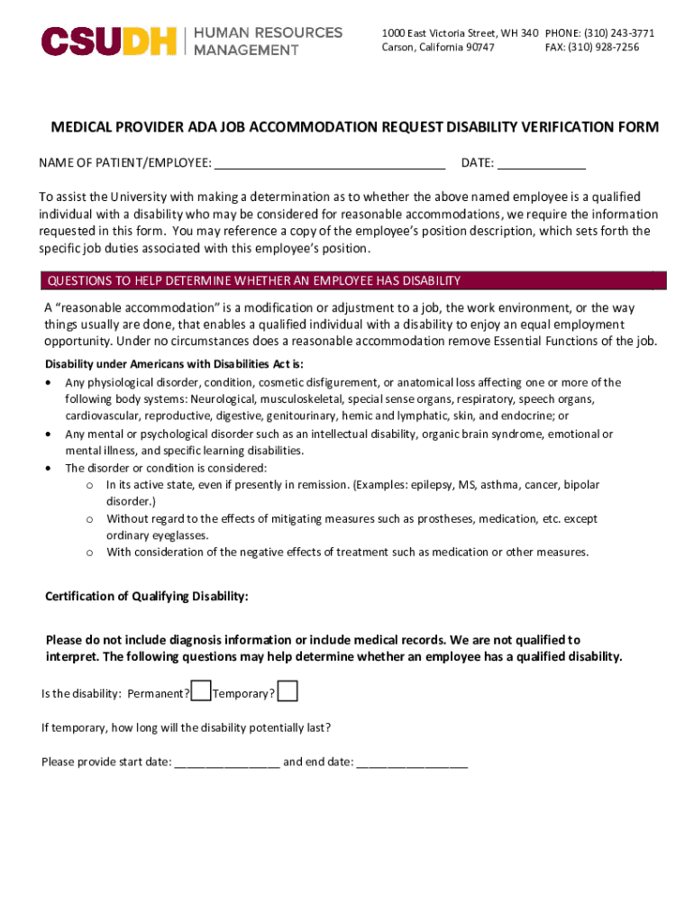1000 East Victoria Street, WH 340 PHONE: (310) 2433771 Carson, California 90747 FAX: (310) 9287256MEDICAL PROVIDER ADA JOB ACCOMMODATION REQUEST DISABILITY VERIFICATION FORM NAME OF PATIENT/EMPLOYEE: