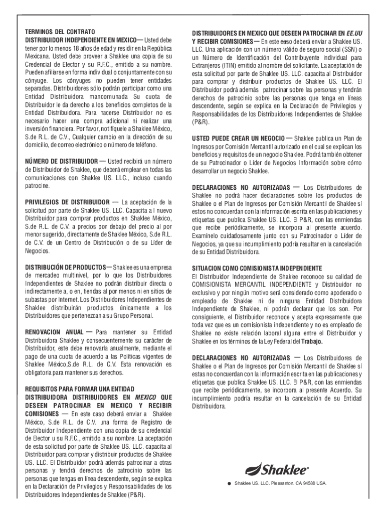TERMINOS DEL CONTRATO DISTRIBUIDOR INDEPENDIENTE EN MEXICO Usted debe tener por lo menos 18 aos de edad y residir en la Repblica Mexicana. Usted debe proveer a Shaklee una copia de su Credencial de
