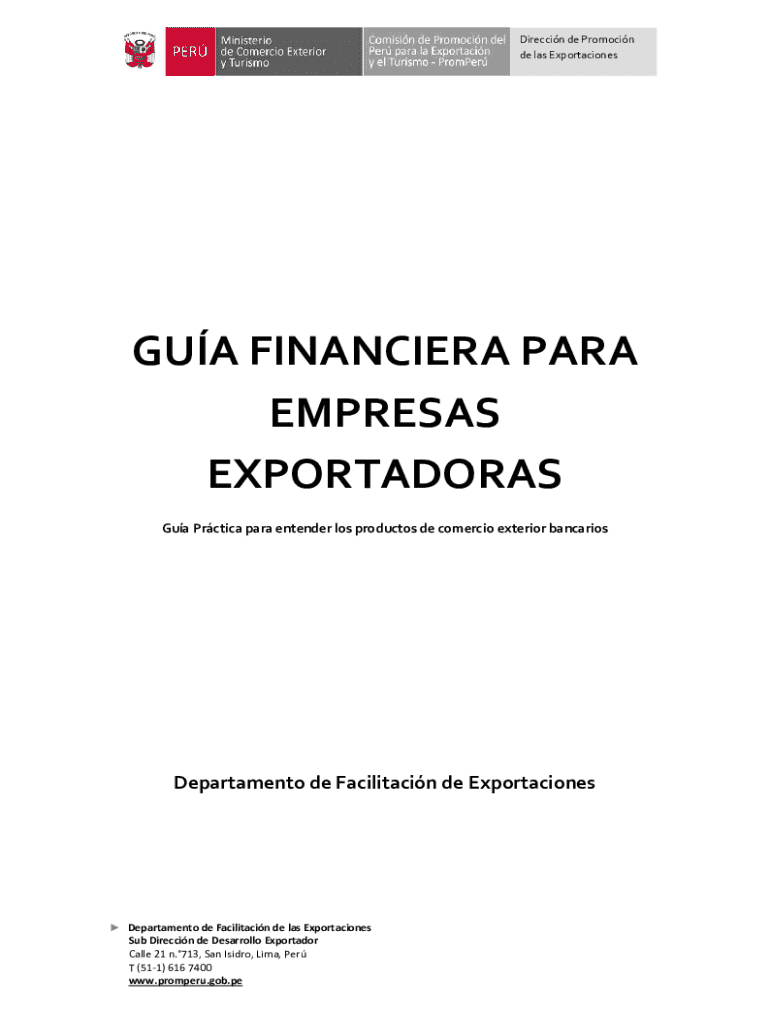 Direccin de Promocin de las ExportacionesGUA FINANCIERA PARA EMPRESAS EXPORTADORAS Gua Prctica para entender los productos de comercio exterior bancariosDepartamento de Facilitacin de Exportaciones