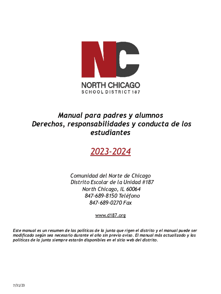 Manual para padres y alumnos Derechos, responsabilidades y conducta de los estudiantes20232024 Comunidad del Norte de Chicago Distrito Escolar de la Unidad #187 North Chicago, IL 60064 8476898150
