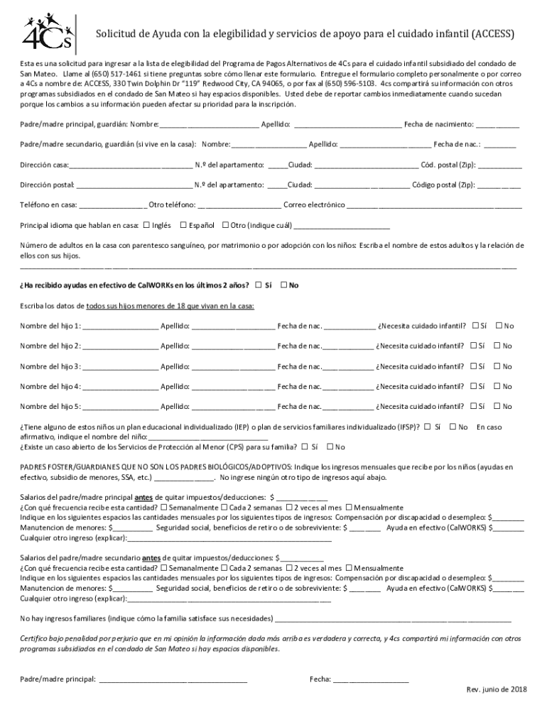Solicitud de Ayuda con la elegibilidad y servicios de apoyo para el cuidado infantil (ACCESS) Esta es una solicitud para ingresar a la lista de elegibilidad del Programa de Pagos Alternativos de 4Cs