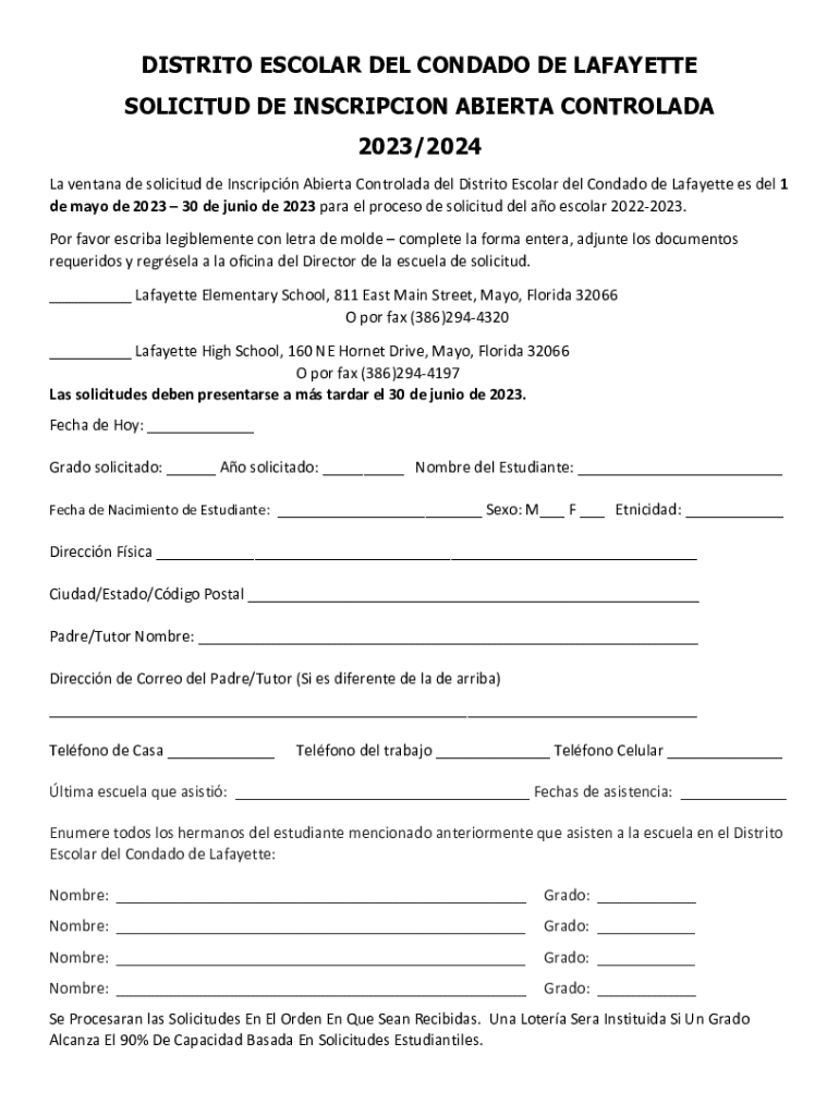 DISTRITO ESCOLAR DEL CONDADO DE LAFAYETTE SOLICITUD DE INSCRIPCION ABIERTA CONTROLADA 2023/2024 La ventana de solicitud de Inscripcin Abierta Controlada del Distrito Escolar del Condado de Lafayette