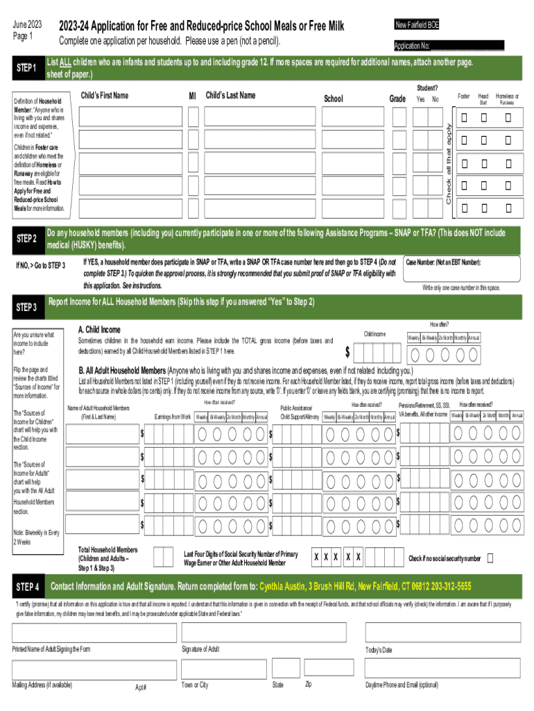 June 2023 Page 1STEP 1202324 Application for Free and Reducedprice School Meals or Free MilkNew Fairfield BOEComplete one application per household. Please use a pen (not a pencil).Application No: